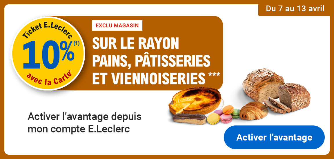 Offre à activer sur l’application Mon E.Leclerc ou sur le site e.leclerc dans la rubrique «Avantages», limitée à une utilisation par semaine, sur présentation en caisse de la Carte E.Leclerc et valable uniquement dans les Centres E.Leclerc en France, Corse comprise, hors DROM-COM. Offre non valable en Drive E.Leclerc et E.Leclerc Chez Moi. Sous réserve que votre magasin participe aux avantages de cette opération et sous réserve de l’assortiment du magasin.