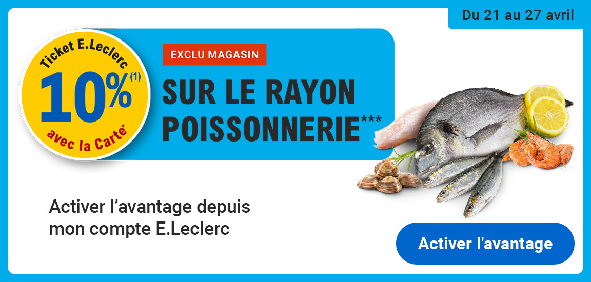 Auteur Sujet: Leclerc : 10% en tickets leclerc sur le rayon poissonnerie (21/04 - 27/04)  (Lu 600 fois)