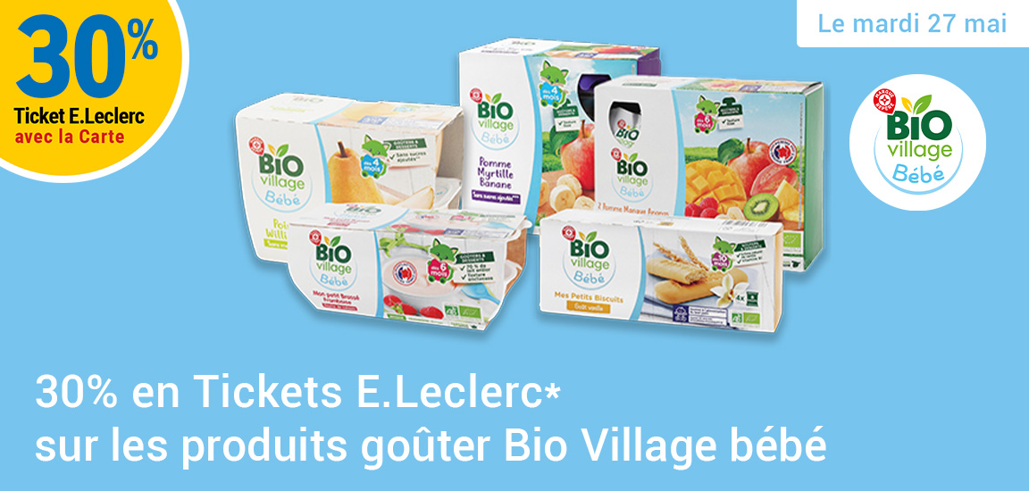 Leclerc : 30% en tickets leclerc sur produits goûter Bio Village bébé (Le 27/05)