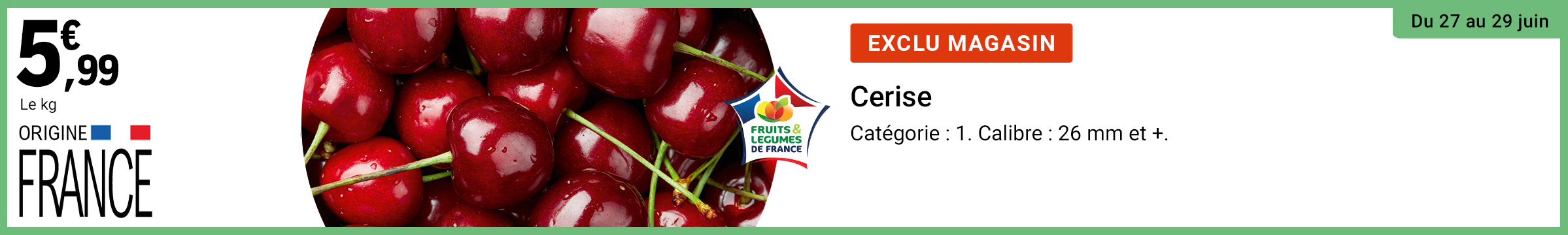 Leclerc : cerise origine France 5.99€ le kg (27/06 - 29/06)