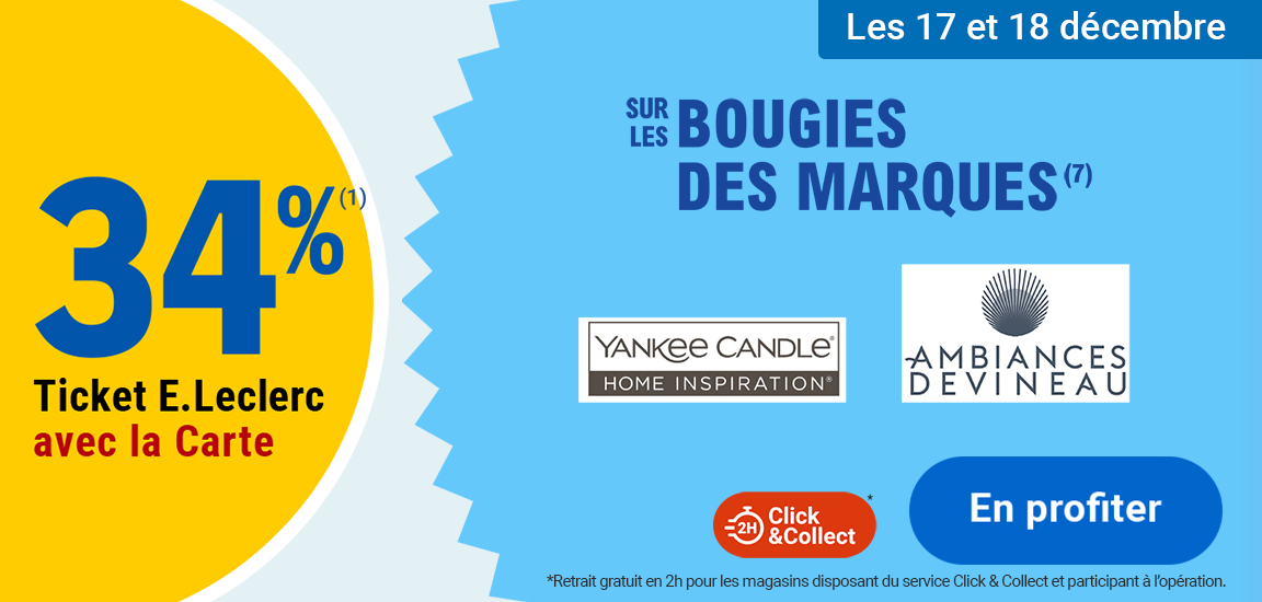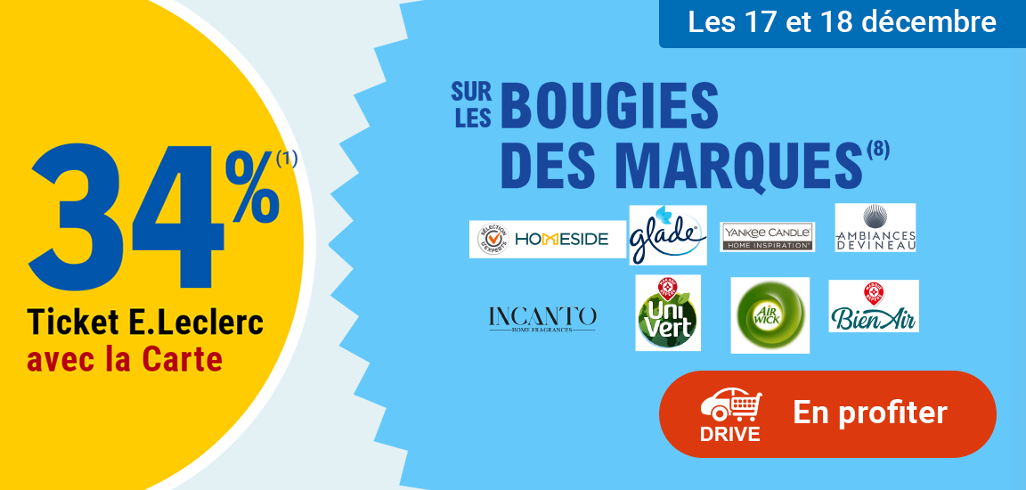Auteur Sujet: Leclerc : 34% en ticket leclerc sur sélection marques de bougies (17/12 - 18/12)  (Lu 67 fois)