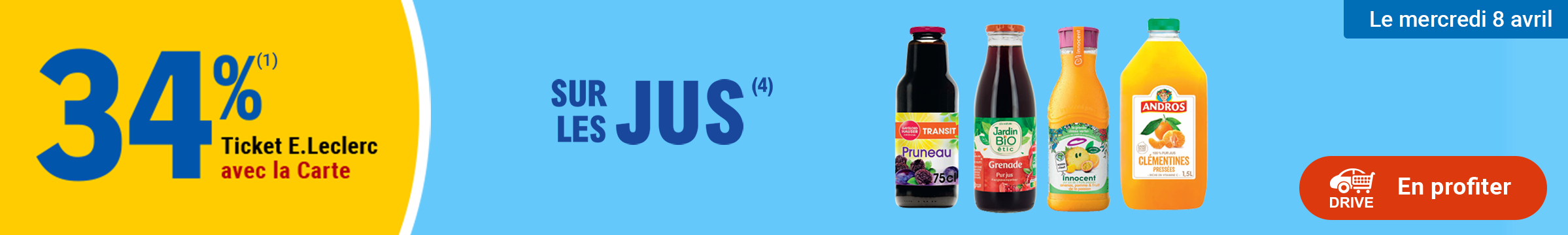 (1) Offre en Ticket E.Leclerc non cumulable avec des produits de la même gamme bénéficiant d’un autre « Ticket E.Leclerc » ou d’une autre promotion. Bon d’achat réservé aux porteurs de la Carte E.Leclerc, sur présentation en caisse de la Carte E.Leclerc et valable dès le lendemain de son obtention, cumulable sur la Carte E.Leclerc et utilisable sur tous les produits de l’ensemble des centres E.Leclerc participant au programme de fidélité. Offre limitée à 15 produits par foyer par opération et non cumulable avec des produits de la même gamme bénéficiant d’un autre « Ticket E.Leclerc » ou d’une autre promotion. Carte E.Leclerc 100 % gratuite et disponible immédiatement. Offre réservée à une consommation personnelle. Le magasin se réserve le droit de refuser toute demande d’une quantité supérieure aux besoins habituels généralement constatés pour une consommation personnelle. Offre interdite à la revente. Offre non cumulable avec des produits de la même gamme bénéficiant d’une autre promotion et non valable sur les produits signalés en magasin.