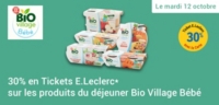 Leclerc : 30% en tickets leclerc produits déjeuner Bio Village bébé