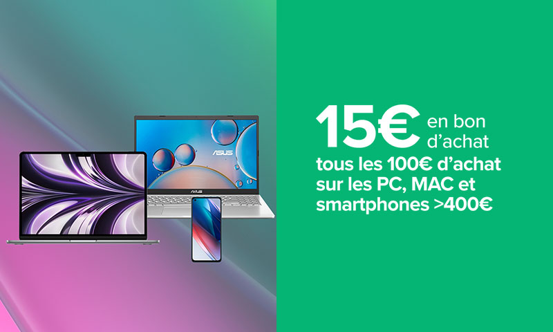 Tous les 100€ d’achat sur tous les ordinateurs PC, Mac et les smartphones (dès 400€) disponibles dans l’un de nos hypermarchés Carrefour situés en France métropolitaine, Corse comprise et participants à l’opération, recevez 15€ en bon d’achat !