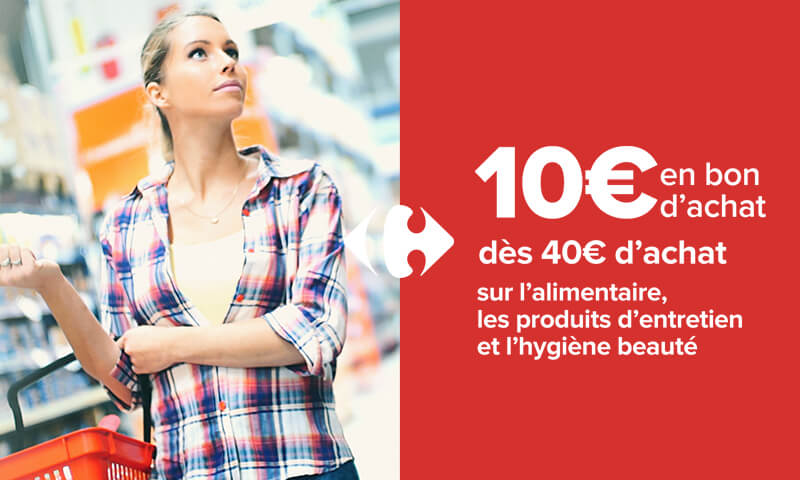 Dès 40 euros d’achat sur l’épicerie (hors vins, champagnes et alcools), le frais en libre-service (hors traditionnel), les produits d’entretien et l’hygiène beauté (hors parapharmacie) dans l’un de nos supermarchés Carrefour Market et Market (Hors Carrefour Drive) situés en France métropolitaine, Corse comprise et participants à l’opération, recevez 10€ en bon d’achat !