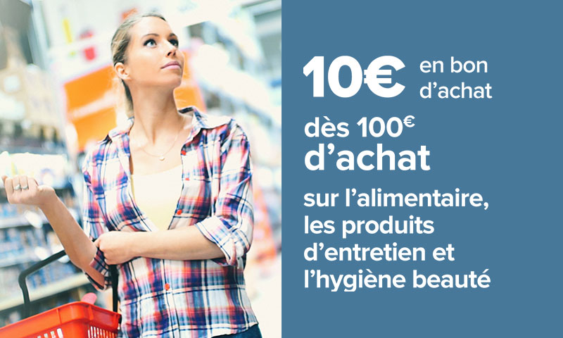 Dès 100€ d’achat sur l’alimentaire (hors vins, champagnes, bières, cidres et alcool), l’hygiène et beauté (hors parapharmacie et petit électroménager beauté), et produits d’entretien, disponibles dans nos hypermarchés Carrefour participants (Hors Carrefour Drive et Marketplace) situés en France métropolitaine, recevez un 10€ en bon d’achat !