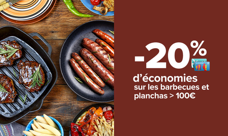 Profitez de 20% crédités sur votre carte de fidélité Carrefour sur les barbecues et planchas supérieurs à 100€, hors promotion en cours, achetés dans l’un de nos Hypermarchés Carrefour, leur Drive et en Livraison à domicile (hors livraison express et marketplace), situés en France métropolitaine, Corse comprise, et participants à l’opération.