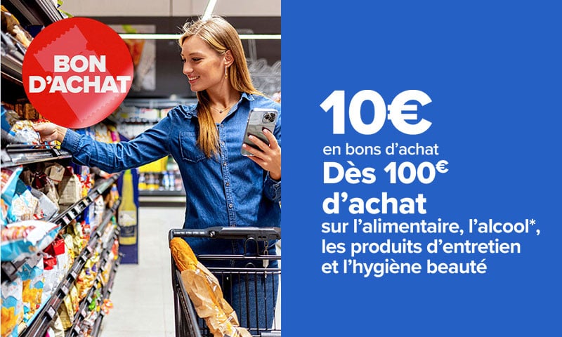 Dès 100€ d’achat sur l’alimentaire, les bières, les cidres et l’alcool (hors vins, champagnes et effervescents), l’hygiène et beauté (hors parapharmacie et petit électroménager beauté) et les produits d’entretien disponibles dans nos hypermarchés Carrefour participants situés en France métropolitaine, recevez 1 bon d’achat de 10€ !