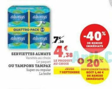 Sujet: Serviettes always Ultra chez Magasins U (05/09 - 17/09) (Lu 188 fois)