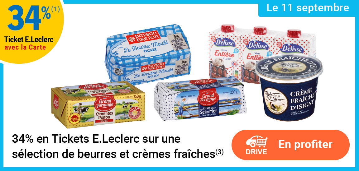 (1) Offre en Ticket E.Leclerc non cumulable avec des produits de la même gamme bénéficiant d’un autre « Ticket E.Leclerc » ou d’une autre promotion. Bon d’achat réservé aux porteurs de la Carte E.Leclerc, sur présentation en caisse de la Carte E.Leclerc et valable dès le lendemain de son obtention, cumulable sur la Carte E.Leclerc et utilisable sur tous les produits de l’ensemble des centres E.Leclerc participant au programme de fidélité. Offre limitée à 15 produits par foyer par opération et non cumulable avec des produits de la même gamme bénéficiant d’un autre « Ticket E.Leclerc » ou d’une autre promotion. Carte E.Leclerc 100 % gratuite et disponible immédiatement. Offre réservée à une consommation personnelle. Le magasin se réserve le droit de refuser toute demande d’une quantité supérieure aux besoins habituels généralement constatés pour une consommation personnelle. Offre interdite à la revente. Offre non cumulable avec des produits de la même gamme bénéficiant d’une autre promotion et non valable sur les produits signalés en magasin.