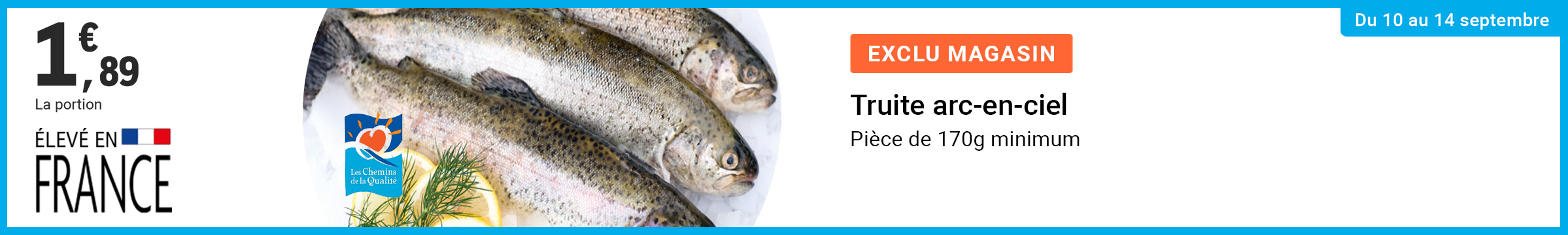 Leclerc : truite arc-en-ciel élevée en France 1.89€ la portion (10/09 - 14/09)