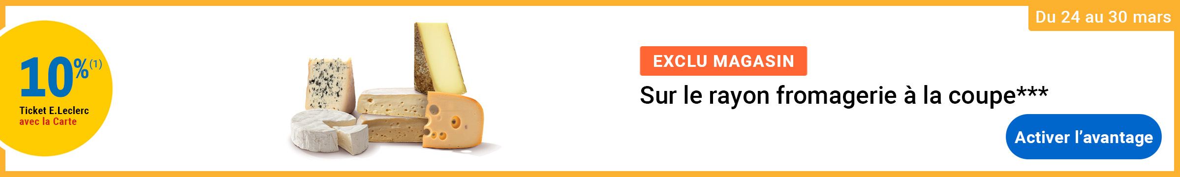 Offre à activer sur l’application Mon E.Leclerc ou sur le site e.leclerc dans la rubrique «Avantages», limitée à une utilisation par semaine, sur présentation en caisse de la Carte E.Leclerc et valable uniquement dans les Centres E.Leclerc en France, Corse comprise, hors DROM-COM. Offre non valable en Drive E.Leclerc et E.Leclerc Chez Moi. Sous réserve que votre magasin participe aux avantages de cette opération et sous réserve de l’assortiment du magasin. Voir conditions de l’offre sur votre compte