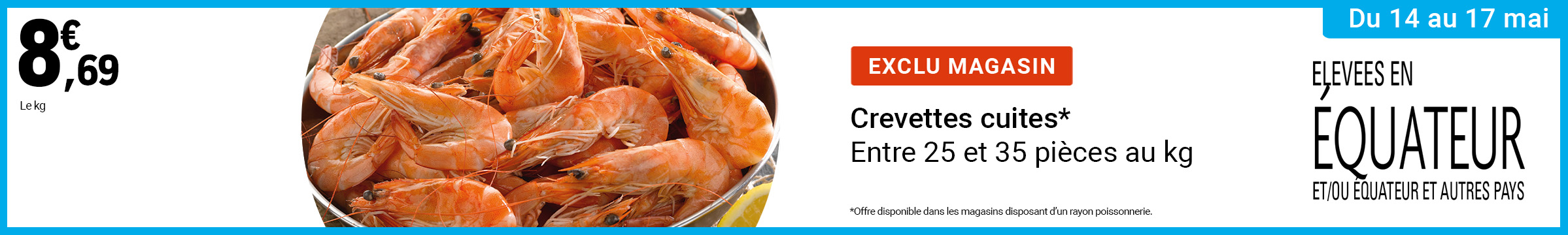 Leclerc : crevettes cuites élevées Equateur/autres pays 8.69€ le kg (14/5-17/5)