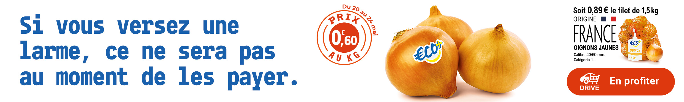 Sujet: Leclerc : oignons jaunes origine France 0.89€ le filet de 1.5kg (20/05 - 24/05) (Lu 1086 fois)