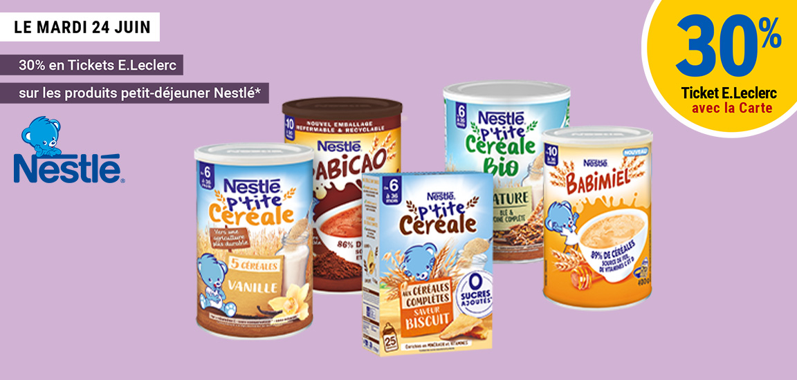 Leclerc : 30% en tickets leclerc sur produits petit-déjeuner Nestlé (Le 24/06)
