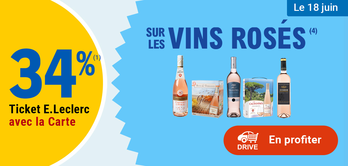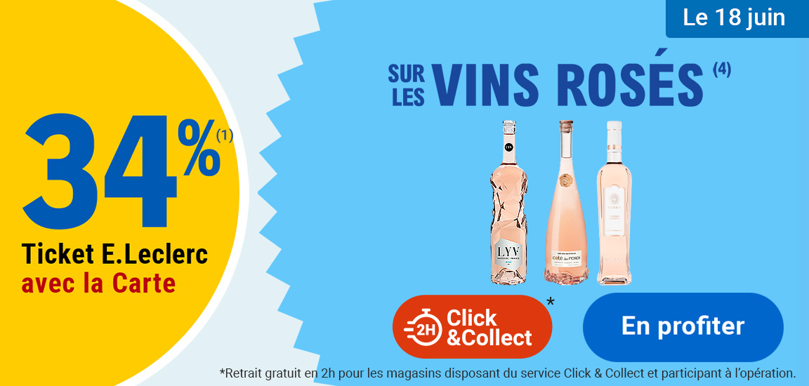(1) Offre en Ticket E.Leclerc non cumulable avec des produits de la même gamme bénéficiant d’un autre « Ticket E.Leclerc » ou d’une autre promotion. Bon d’achat réservé aux porteurs de la Carte E.Leclerc, sur présentation en caisse de la Carte E.Leclerc et valable dès le lendemain de son obtention, cumulable sur la Carte E.Leclerc et utilisable sur tous les produits de l’ensemble des centres E.Leclerc participant au programme de fidélité. Offre limitée à 15 produits par foyer par opération et non cumulable avec des produits de la même gamme bénéficiant d’un autre « Ticket E.Leclerc » ou d’une autre promotion. Carte E.Leclerc 100 % gratuite et disponible immédiatement. Offre réservée à une consommation personnelle. Le magasin se réserve le droit de refuser toute demande d’une quantité supérieure aux besoins habituels généralement constatés pour une consommation personnelle. Offre interdite à la revente. Offre non cumulable avec des produits de la même gamme bénéficiant d’une autre promotion et non valable sur les produits signalés en magasin.