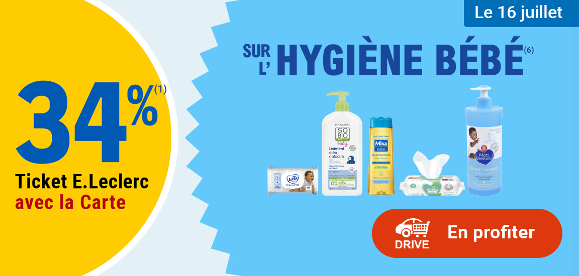 (1) Offre en Ticket E.Leclerc non cumulable avec des produits de la même gamme bénéficiant d’un autre « Ticket E.Leclerc » ou d’une autre promotion. Bon d’achat réservé aux porteurs de la Carte E.Leclerc, sur présentation en caisse de la Carte E.Leclerc et valable dès le lendemain de son obtention, cumulable sur la Carte E.Leclerc et utilisable sur tous les produits de l’ensemble des centres E.Leclerc participant au programme de fidélité. Offre limitée à 15 produits par foyer par opération et non cumulable avec des produits de la même gamme bénéficiant d’un autre « Ticket E.Leclerc » ou d’une autre promotion. Carte E.Leclerc 100 % gratuite et disponible immédiatement. Offre réservée à une consommation personnelle. Le magasin se réserve le droit de refuser toute demande d’une quantité supérieure aux besoins habituels généralement constatés pour une consommation personnelle. Offre interdite à la revente. Offre non cumulable avec des produits de la même gamme bénéficiant d’une autre promotion et non valable sur les produits signalés en magasin.