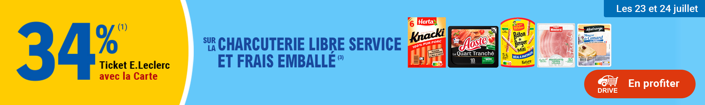 Auteur Sujet: Leclerc : 34% en ticket charcuterie libre service/frais emballé (23/7 - 24/7)  (Lu 891 fois)