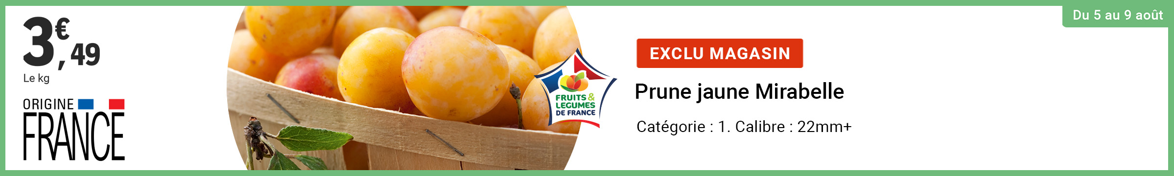 Leclerc : prune jaune mirabelle origine France 3.49€ le kg (05/08 - 09/08)