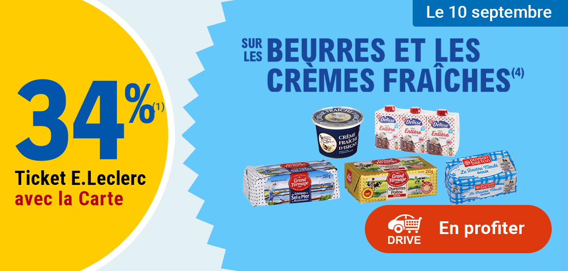 Auteur Sujet: Leclerc : 34% en ticket leclerc sur les beurres et les crème fraiches (Le 10/09)  (Lu 598 fois)