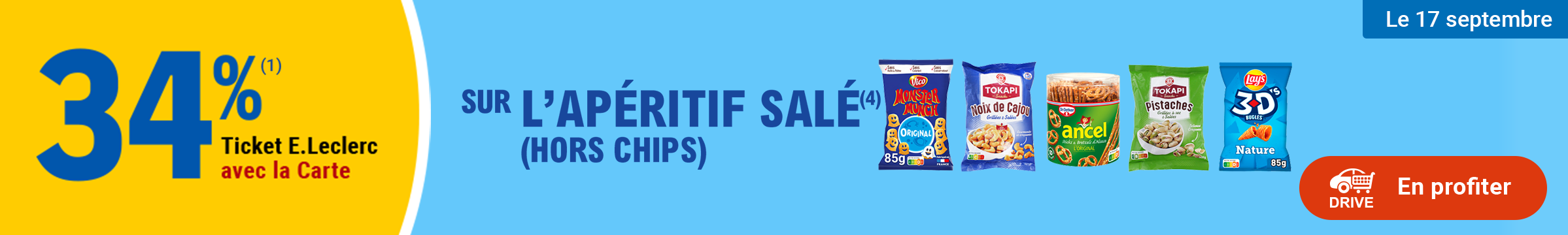 Auteur Sujet: Leclerc : 34% en ticket leclerc sur l'apéritif salé (hors chips) (Le 17/09)  (Lu 527 fois)