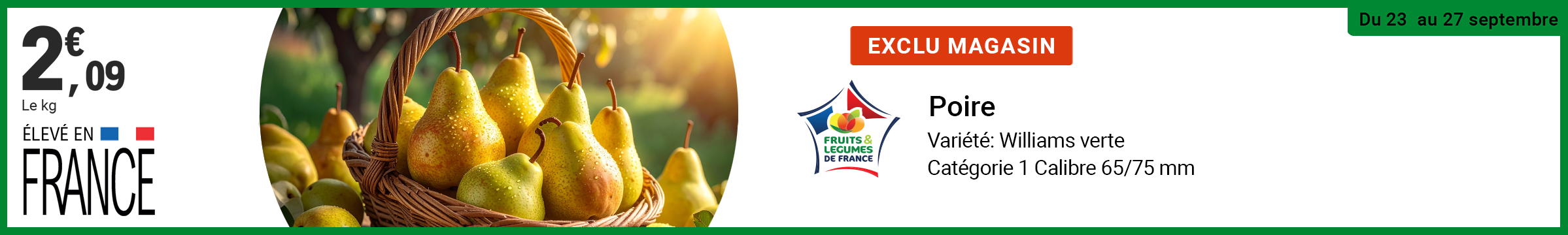 Leclerc : poire williams origine France 2.09€ le kg (23/09 - 27/09)