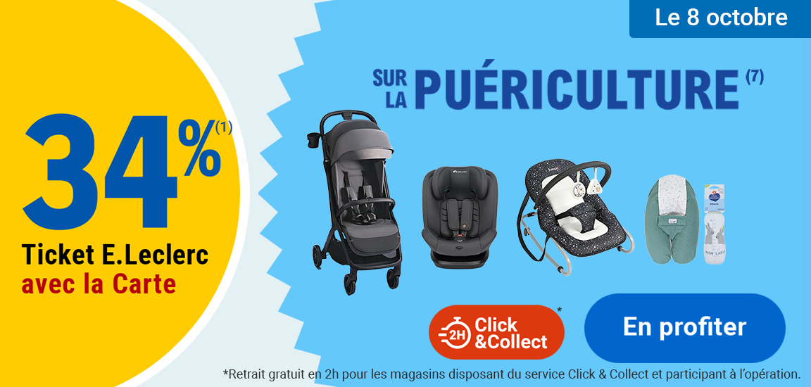 (1) Offre en Ticket E.Leclerc non cumulable avec des produits de la même gamme bénéficiant d’un autre « Ticket E.Leclerc » ou d’une autre promotion. Bon d’achat réservé aux porteurs de la Carte E.Leclerc, sur présentation en caisse de la Carte E.Leclerc et valable dès le lendemain de son obtention, cumulable sur la Carte E.Leclerc et utilisable sur tous les produits de l’ensemble des centres E.Leclerc participant au programme de fidélité. Offre limitée à 15 produits par foyer par opération et non cumulable avec des produits de la même gamme bénéficiant d’un autre « Ticket E.Leclerc » ou d’une autre promotion. Carte E.Leclerc 100 % gratuite et disponible immédiatement. Offre réservée à une consommation personnelle. Le magasin se réserve le droit de refuser toute demande d’une quantité supérieure aux besoins habituels généralement constatés pour une consommation personnelle. Offre interdite à la revente. Offre non cumulable avec des produits de la même gamme bénéficiant d’une autre promotion et non valable sur les produits signalés en magasin.