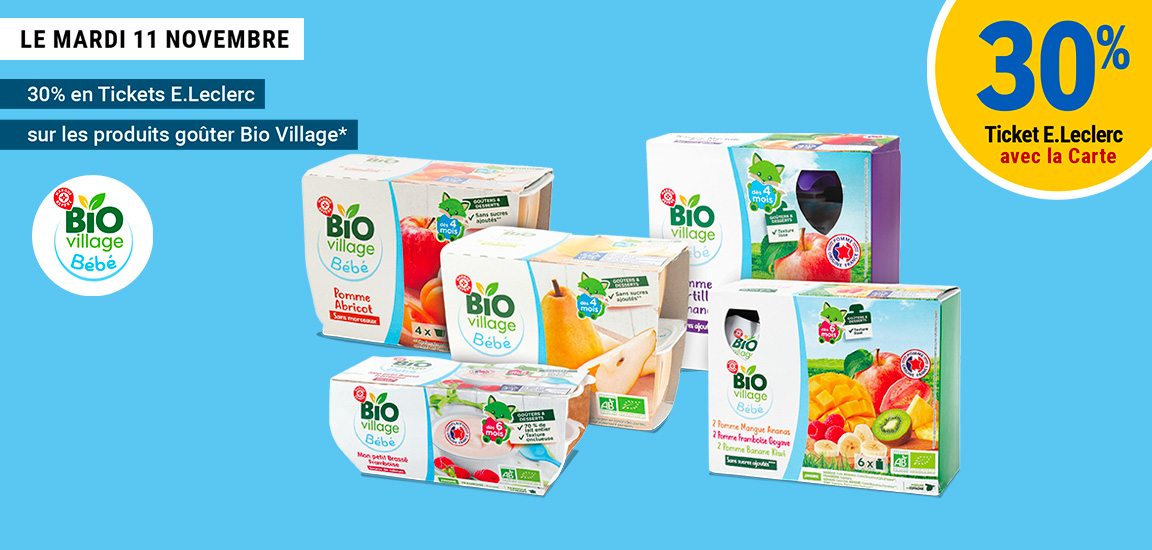 Leclerc : 30% en ticket leclerc sur les produits goûter Bio Village (Le 11/11)