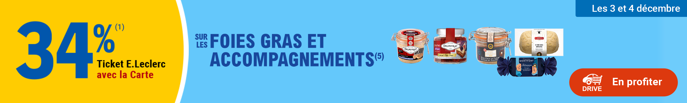 (5) Hors foies gras crus du rayon boucherie/volaille et foies gras surgelés. Non valable sur les corbeilles et compositions, les terrines, le pâté, les produits Eco+. Valable sur les marques Delpeyrat, Labeyrie, Montfort (EURALIS), Lartigue et Grenier des Gastronomes sur les produits foie gras et sur les produits (chutney, pain d’épices, confit, pain toasté, confiture, givre de sel, sel, crème de vinaigre et baguette).