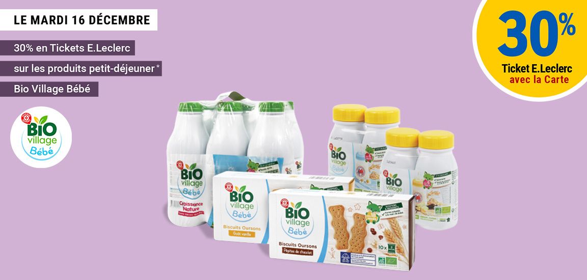 Leclerc : 30% ticket leclerc produits petit-déjeuner Bio Village Bébé (Le 16/12)