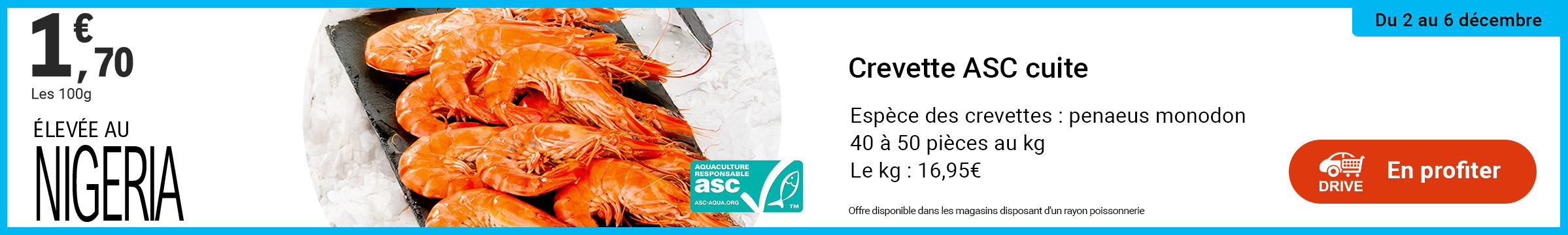 Leclerc : crevette ASC cuite élevée au Nigéria 1.70€ les 100g (02/12 - 06/12)