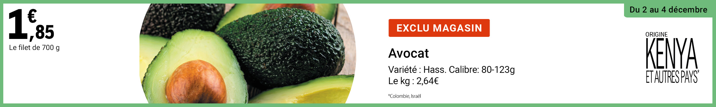 Leclerc : avocat origine Kenya/autres pays 1.85€ le filet de 700g 02/12 - 4/12)
