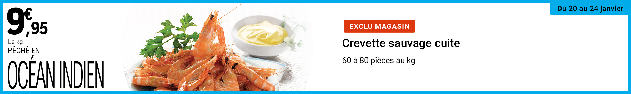 Leclerc : crevette sauvage cuite pêchée en Océan Indien 9.95€ le kg (20/1 - 24/1