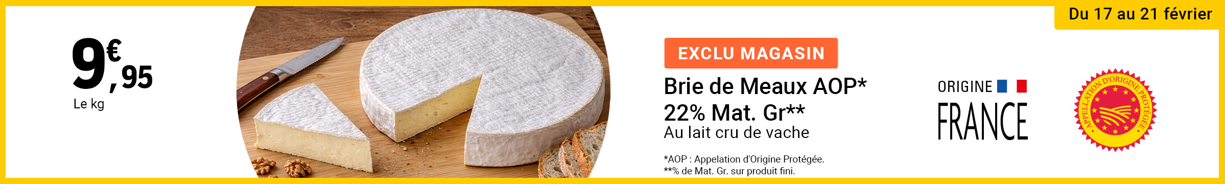 Leclerc : Brie de Meaux AOP origine France 9.95€ le kg (17/02 - 21/02)