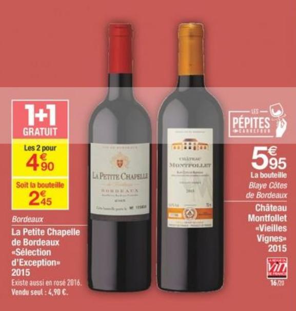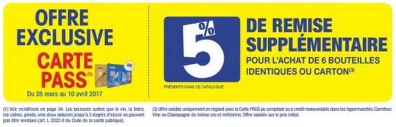 Du vendredi 7 au lundi 10 avril 2017 uniquement, Carrefour vous offre 5 euros en bon d’achat par tranche de 15€ d’achat sur les Vins (hors champagnes et vins pétillants) disponibles dans l’un des hypermarchés à enseigne Carrefour situés en France métropolitaine, Corse comprise et participants à l’opération. L’offre est également valable dans l’ensemble des Carrefour drive à enseigne Carrefour.
